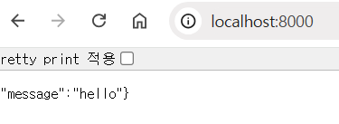 python manage.py runserver그 다음에는 http://localhost:8000/ URL로 접속한 뒤 {'message': 'hello'} 라는 리턴이 나오는지 확인해 보고, 하위 path에 bye, whoami 등의 입력을 해서 테스트해 보시면 끝입니다. 제대로 따라했다면 아래와 같은 형태의 화면이 나올겁니다.