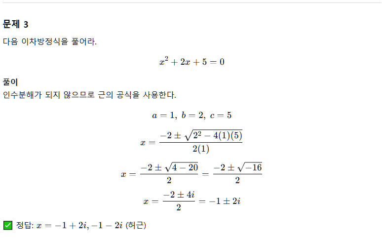 위와 같은 답변을 받았을 때, 만약 허근이 나오는 문제는 너무 어렵다고 생각한다면 난이도 조정을 요청해야 합니다. 그런데, 프롬프트를 한번에 작성했기 때문에 수정이 어려운 상황이지요.