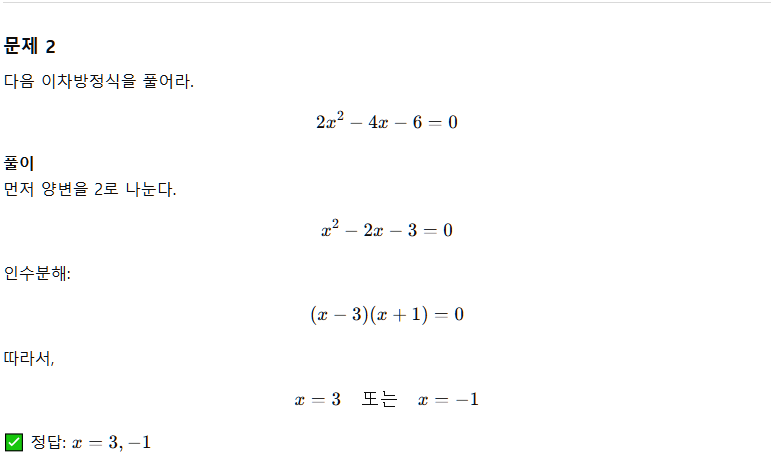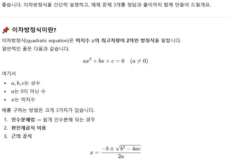 “이차방정식을 간단히 설명하고, 문제를 3개 만들고, 정답과 풀이도 전부 써줘.”