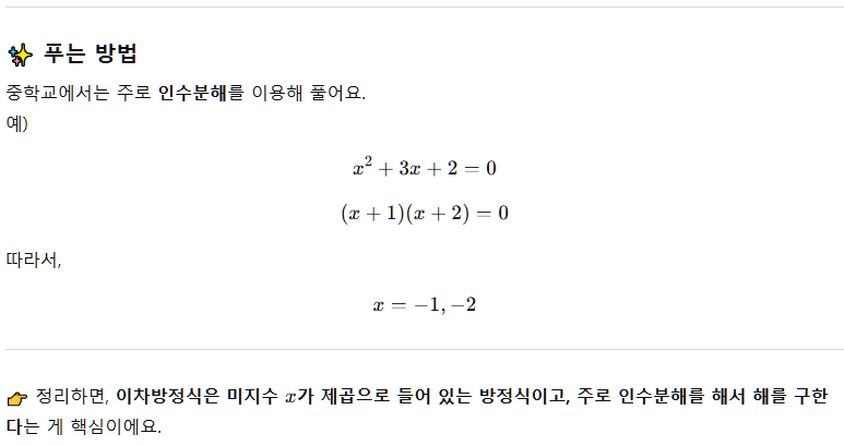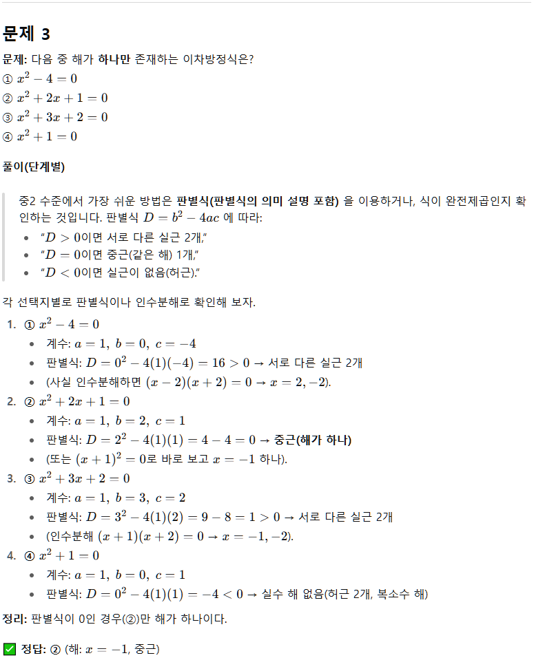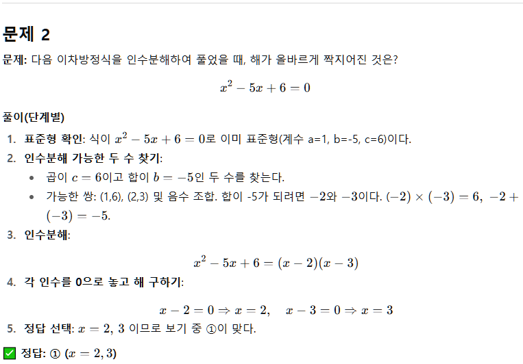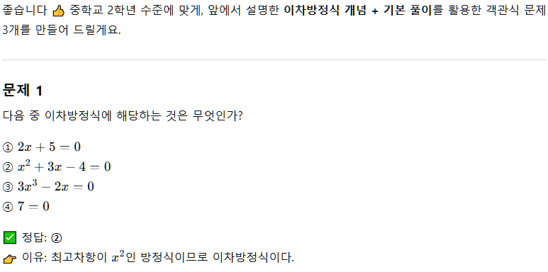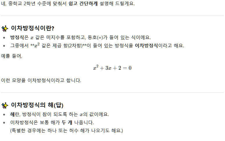 - 첫 번째 프롬프트: “중학교 2학년 수준에서 이차방정식 개념을 간단히 설명해줘.”