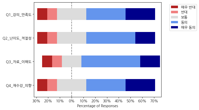 korean_agree_scale = [ "매우 반대", "반대", "보통", "동의", "매우 동의" ]마지막으로 plot_likert 함수를 호출합니다. plot_percentage 매개변수를 True로 입력하면, 응답 수 대신 퍼센트 기준으로 그래프가 표시됩니다.
