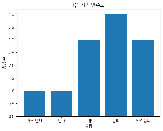 Q1_강의_만족도 Q2_난이도_적절성 Q3_자료_이해도 4_재수강_의향 매우 동의 보통 동의 매우 동의 동의 동의 동의 동의 보통 동의 매우 동의 동의 동의 매우 동의 동의 보통 매우 동의 동의 보통 동의 보통 보통 동의 매우 동의 동의 반대 매우 동의 동의 반대 동의 보통 보통 매우 동의 동의 반대 반대 보통 매우 동의 동의 매우 동의 동의 보통 매우 반대 매우 반대 매우 반대 매우 반대 동의 보통 [데이터 예제] 리커트 5점 척도 기준으로 작성된 가상의 강의 만족도 평가