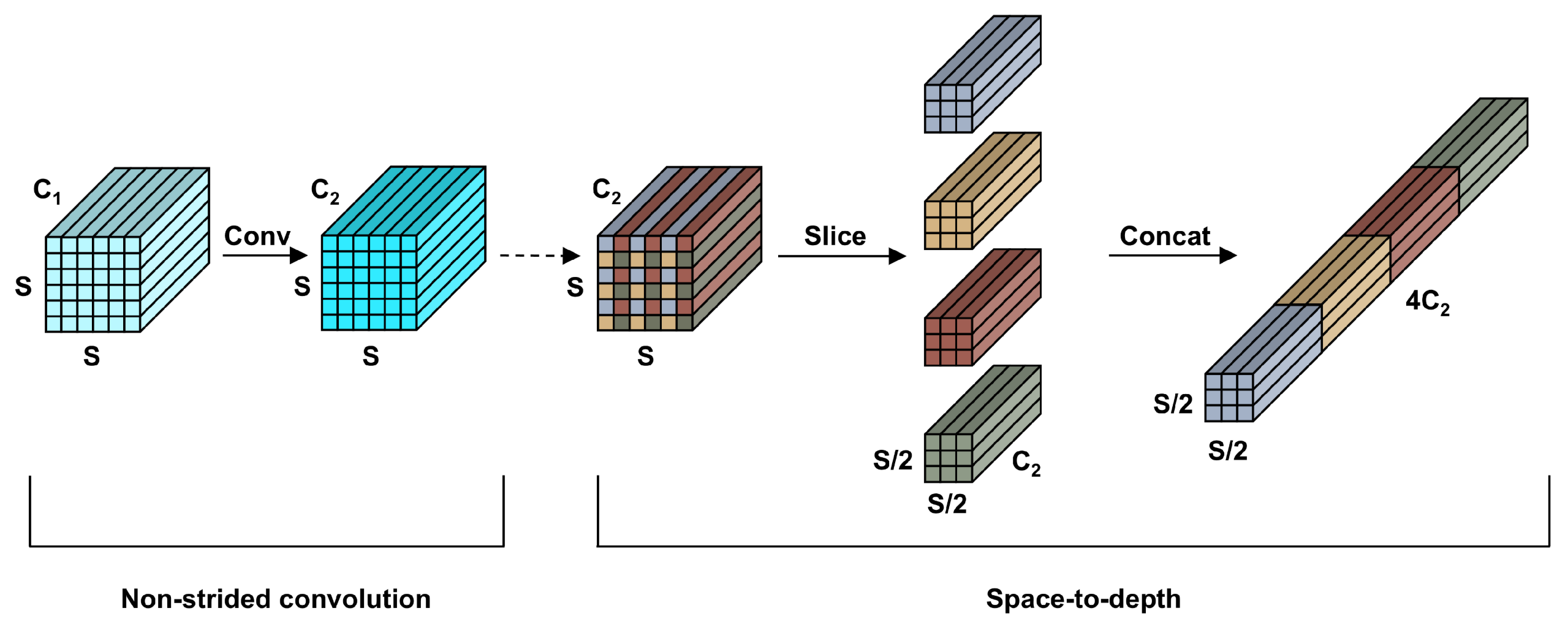 기존 모델은 컨볼루션 레이어를 구성할 때, 스트라이드 컨볼루션이라는 방법을 이용합니다. 이 방법은 이미지 크기를 줄일 때, 픽셀을 건너뛰어가며 체크하는 방식인데, 필연적으로 미세 데이터의 손실이 일어나게 됩니다. 그런데, YOLO-SSW는 비 스트라이드 컨볼루션을 활용하고 공간-깊이 변환(Space to Depth, SPD)을 함께 적용해 미세 데이터의 손실을 최소화한다고 합니다.
