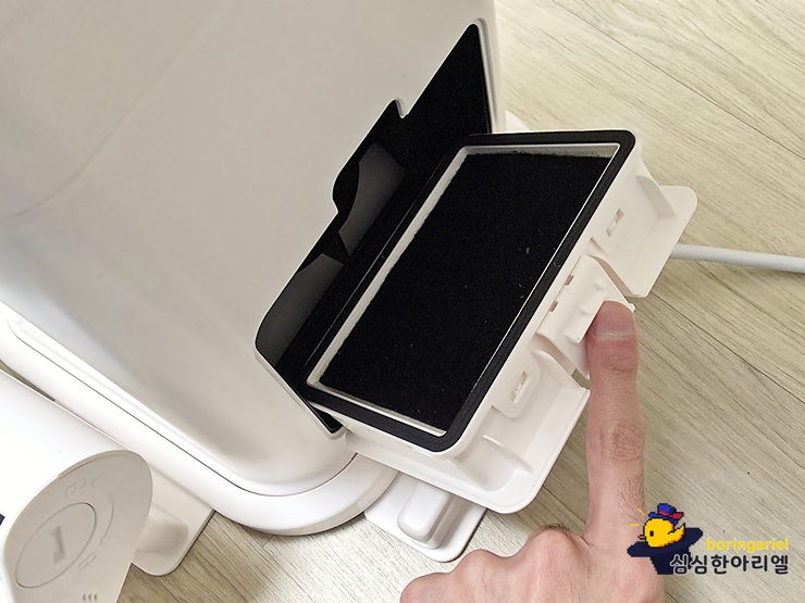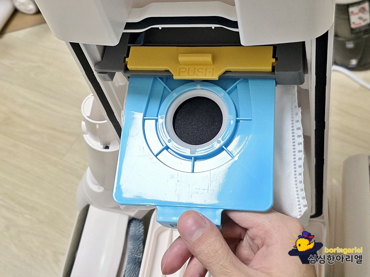 대체로 먼지비움 스테이션을 활용하기 때문에 자주 손대지는 않지만, 먼지통과 필터 탈착이 편리하다는 것도 장점이랍니다. 필터 구성은 상단부의 활성탄 + 헤파 H13 + 보호필터가 있고, 먼지통 부분에는 프리필터와 스틸매쉬 필터가 있어서 깔끔하게 청소할 수 있답니다. 프리필터와 스틸매쉬 크기가 타사에 비해 1.5배 정도는 큰것 같아서 관리가 더 편리한 것도 장점입니다.