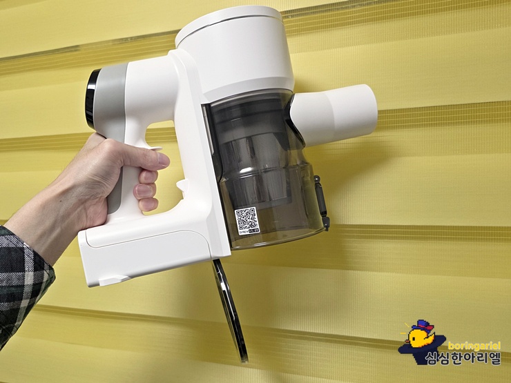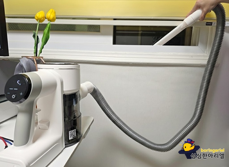 사용 방식에서 가장 독특한 부분은 플렉시블 호스다. 국내에서 유일하게 제공된다고 알려진 이 구성은 무선청소기를 에코백(기본 제공)에 넣고 어깨에 메는 방식으로 활용할 수 있습니다. 저는 주로 본체를 테이블에 올려놓고 창틀을 청소할 때만 이용하는데, 잘만 쓴다면 높은 곳이나 계단, 좁은 공간을 청소할 때 손목 부담을 줄이는 데 도움을 줍니다.
