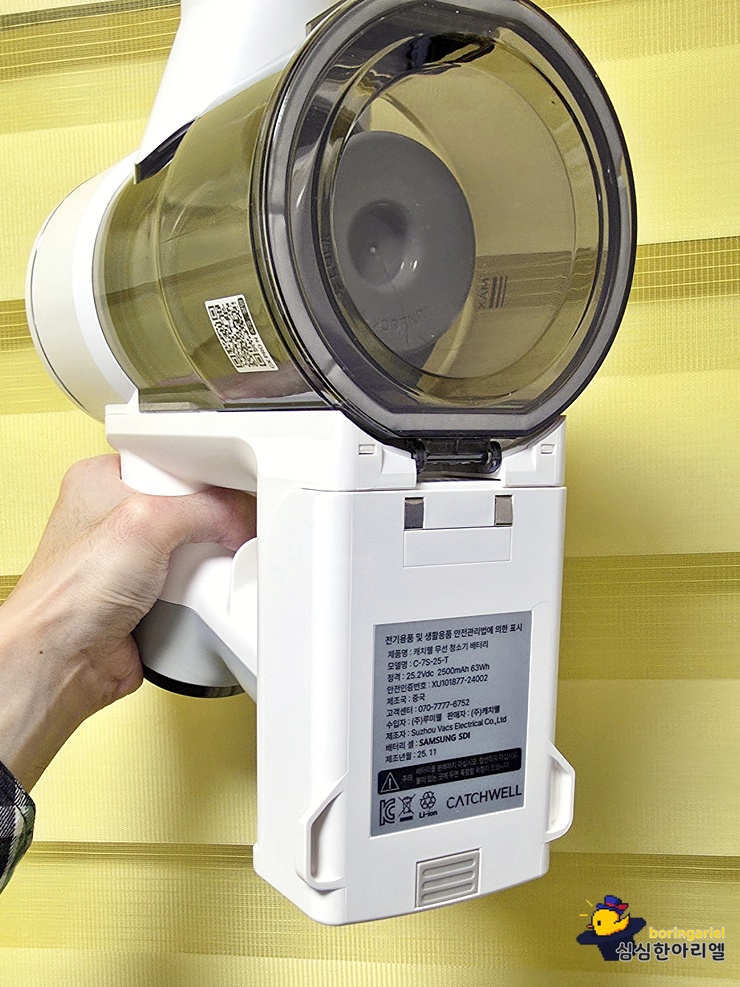배터리는 삼성 SDI 정품 셀을 사용합니다. 배터리 후면에 표기가 되어 있어 확인이 가능한데, 종종 차이슨 무선청소기의 배터리 안정성을 걱정하는 사용자라면 참고할 만한 요소랍니다. 무선청소기에서 배터리는 사용 시간뿐 아니라, 생각보다 교체 비용이 높은 부품이기 때문에 브랜드 배터리 사용 여부를 따져보면 좋을것 같습니다. 배터리타임은 1단 에코모드 최대 60분, 2단 노말모드 최대 30분, 3단 터보모드 최대 10분동안 동작할 수 있습니다.