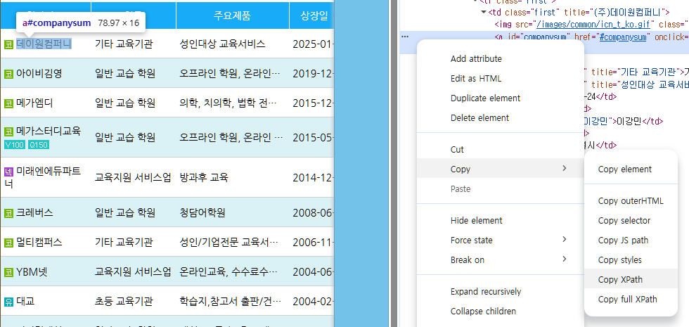 [이미지 3] XPath 확인하기 KIND 데이터를 활용한 상장법인 수집은 실제 분석 작업에서 손쉽게 활용할 수 있는 데이터이기 때문에, 비슷한 방식으로 업종이나 지역 조건을 바꿔서 연습해 보시기 바랍니다. 다른 산업군 데이터도 같은 구조로 정리할 수 있으니 업종과 관계 없이 유용한 스킬이기 때문입니다.
