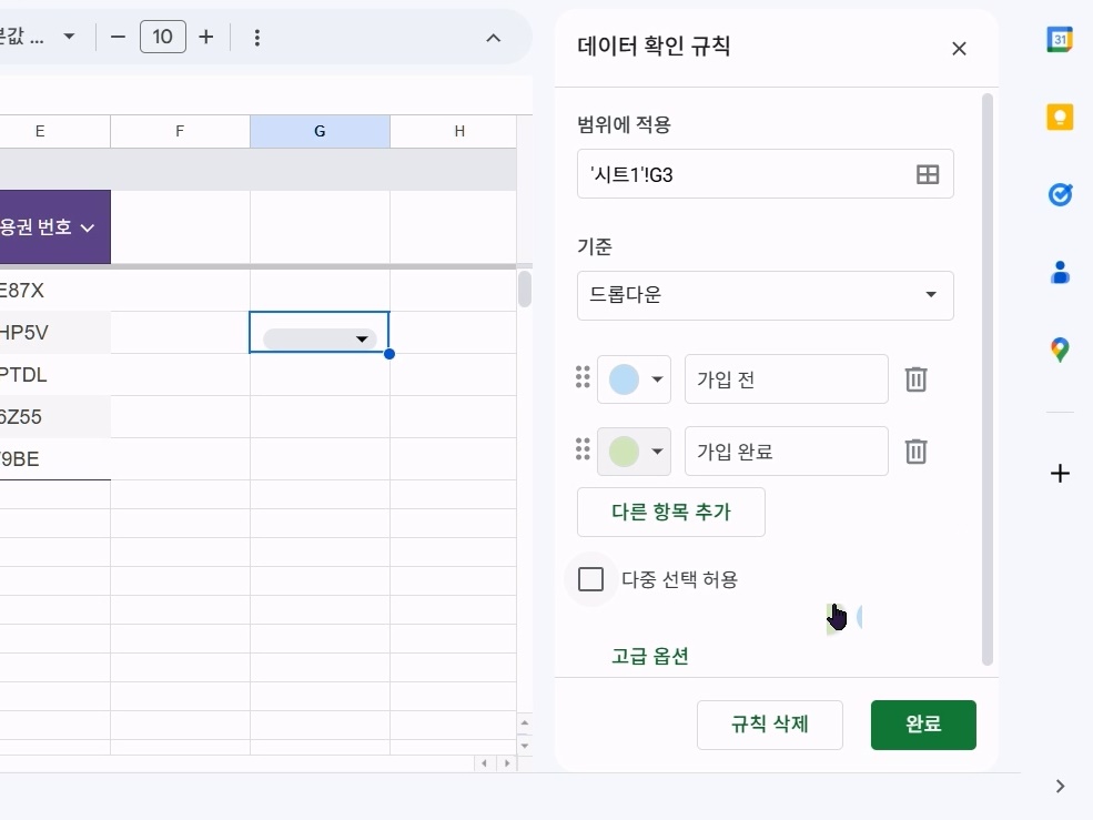 다중 선택이 적용된 드롭다운 데이터 확인 규칙 화면에서 '다중 선택 허용' 체크박스를 누르고 드롭다운 메뉴를 만들면 다중 선택 드롭다운을 사용할 수 있습니다. 이렇게 데이터를 관리하면 간단한 현황 관리 용도로 쓸만한 녀석을 만들 수 있습니다. 다만, 이렇게 관리된 데이터는 이후 함수나 필터를 사용할 때 데이터 처리가 조금 복잡해질 수 있다는 점은 염두에 두는 편이 좋습니다.