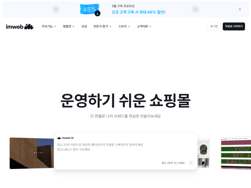 아임웹은 메인 페이지에서 AI를 이용한 웹사이트 제작을 지원하고 있습니다. 최근에는 챗GPT를 비롯한 AI 서비스를 이용해본 경험이 있는 분들이 많으니, 요청사항만 타이핑해 놓으면 알아서 디자인을 해 주는 이런 UI가 익숙하게 느껴질겁니다.