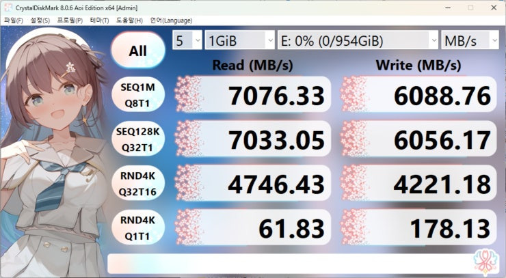 간단하게 벤치마크를 돌려 봤는데, 제 컴퓨터에서는 순차 읽기 7,000MB/s, 쓰기 6,000MB/s 수준으로 측정되더라고요. 이정도 속도라면 현 세대 Gen4 SSD 중에서 상위권에 해당합니다.