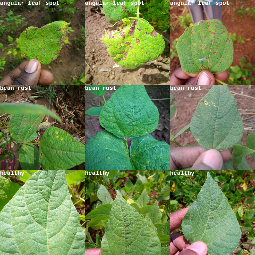 이렇게 콩잎이 찍힌 데이터를 확인할 수 있습니다. 이제는 이 콩잎이 어떤 종류인지(건강한지, 병에 걸렸는지) 알 수 있도록 라벨을 조회할 수 있어야 합니다. 이 콩잎 데이터에는