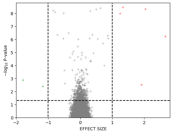 이 시각화에서는 p-value 컷오프를 0.05로, Effect size의 컷오프를 |1|로 설정했습니다. 이는 분석 목적이나 보정 방법에 따라서 유동적으로 변할 수 있기 때문에 통계적으로 검토 후 조절해 주시기 바랍니다.